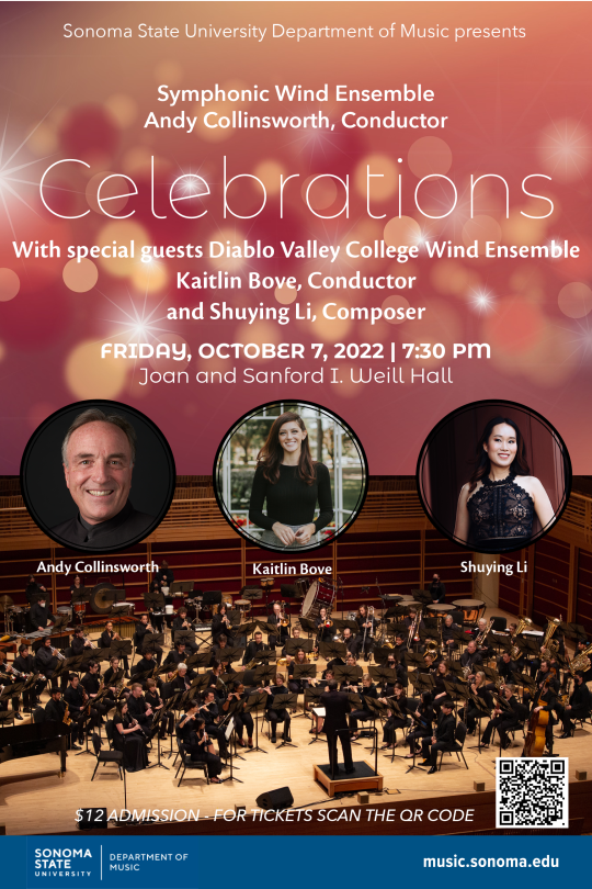 Join us for an evening celebration of wind band music featuring the Sonoma State Symphonic Wind Ensemble and the Diablo Valley College Wind Ensemble under the direction of Dr. Kaitlin Bove.